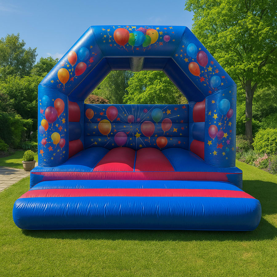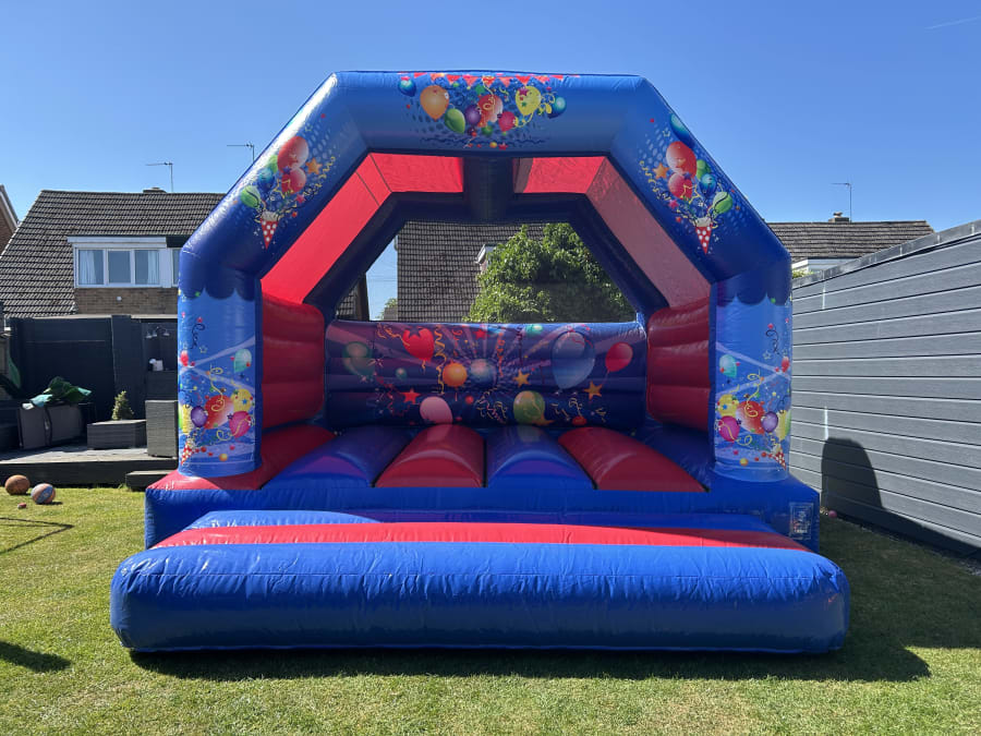 Our Party-Time bouncy castle features a vibrant red and blue color scheme with a fun balloon party theme. It's sure to bring a festive atmosphere to any event, from adult birthday parties and garden parties to BBQs and corporate days.