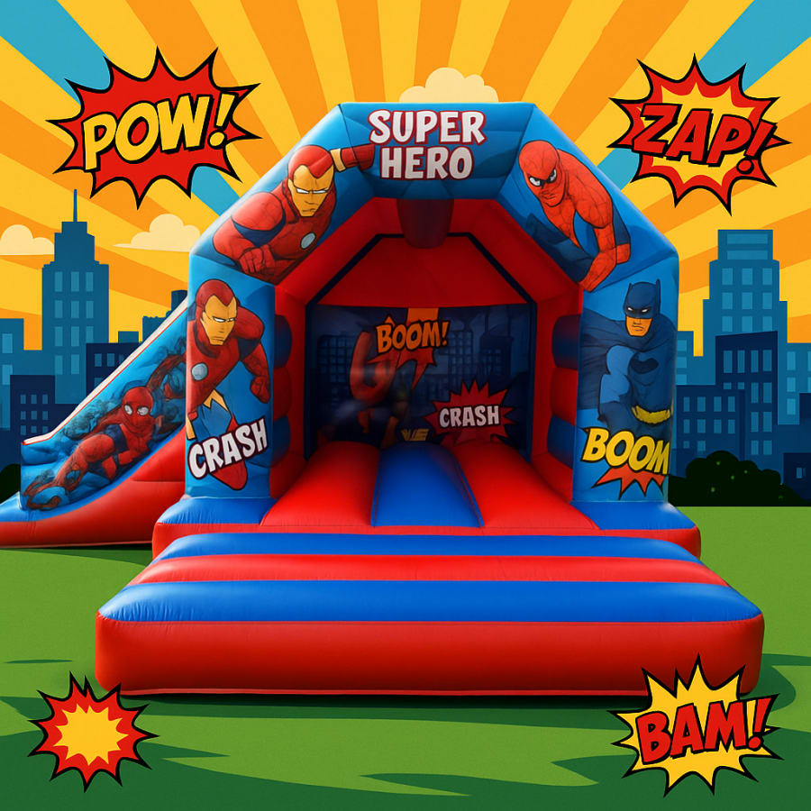 To check availability or to book this Super Heroes Bouncy Castle With Slide, simply click on the up-to-date availability and booking tabs below. Alternatively, you can call our office on 01332 410050. Don't miss out on the opportunity to provide endless entertainment for your super hero-themed party! 📞🎟️