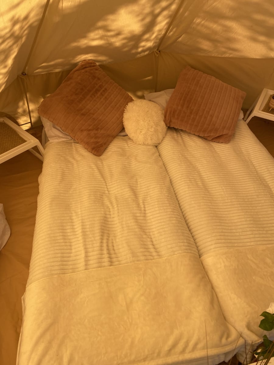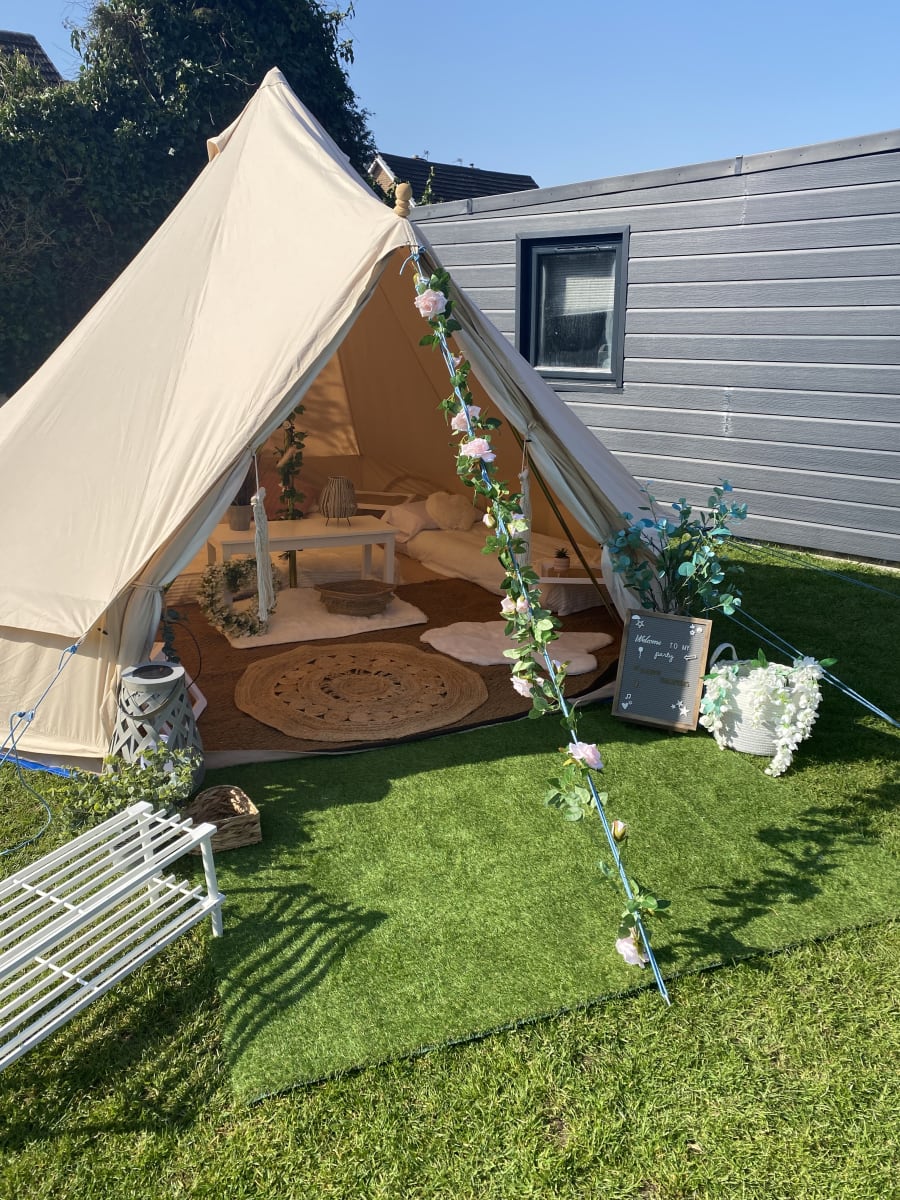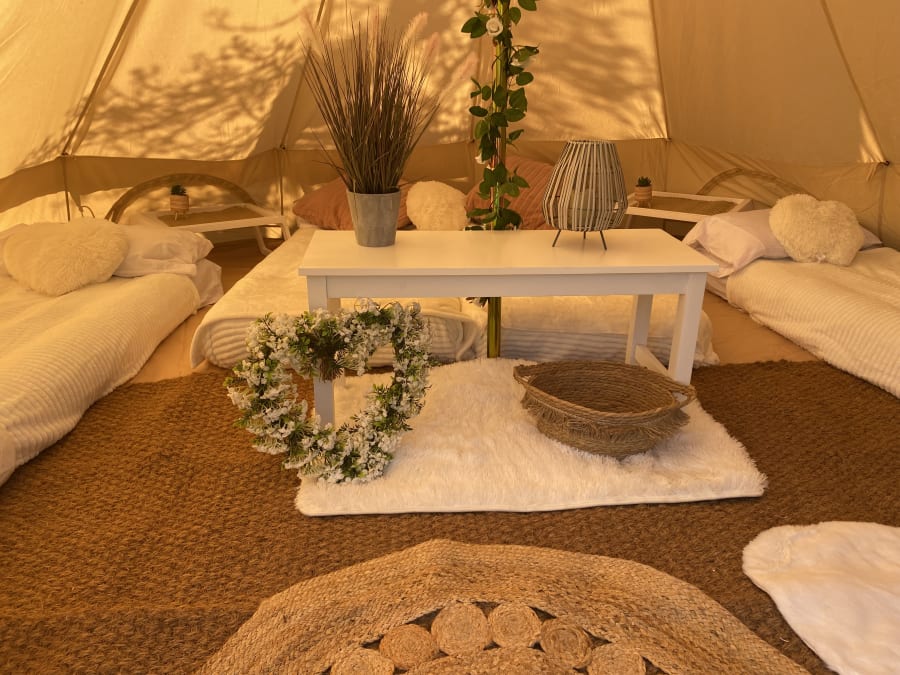 Here we have A Neutral Pink / White Floral Theme option for your bell tent hire. This package comes with everything you see in the photos. All of our accessories come matching for that look of elegance for an exciting slumber party under the stars!